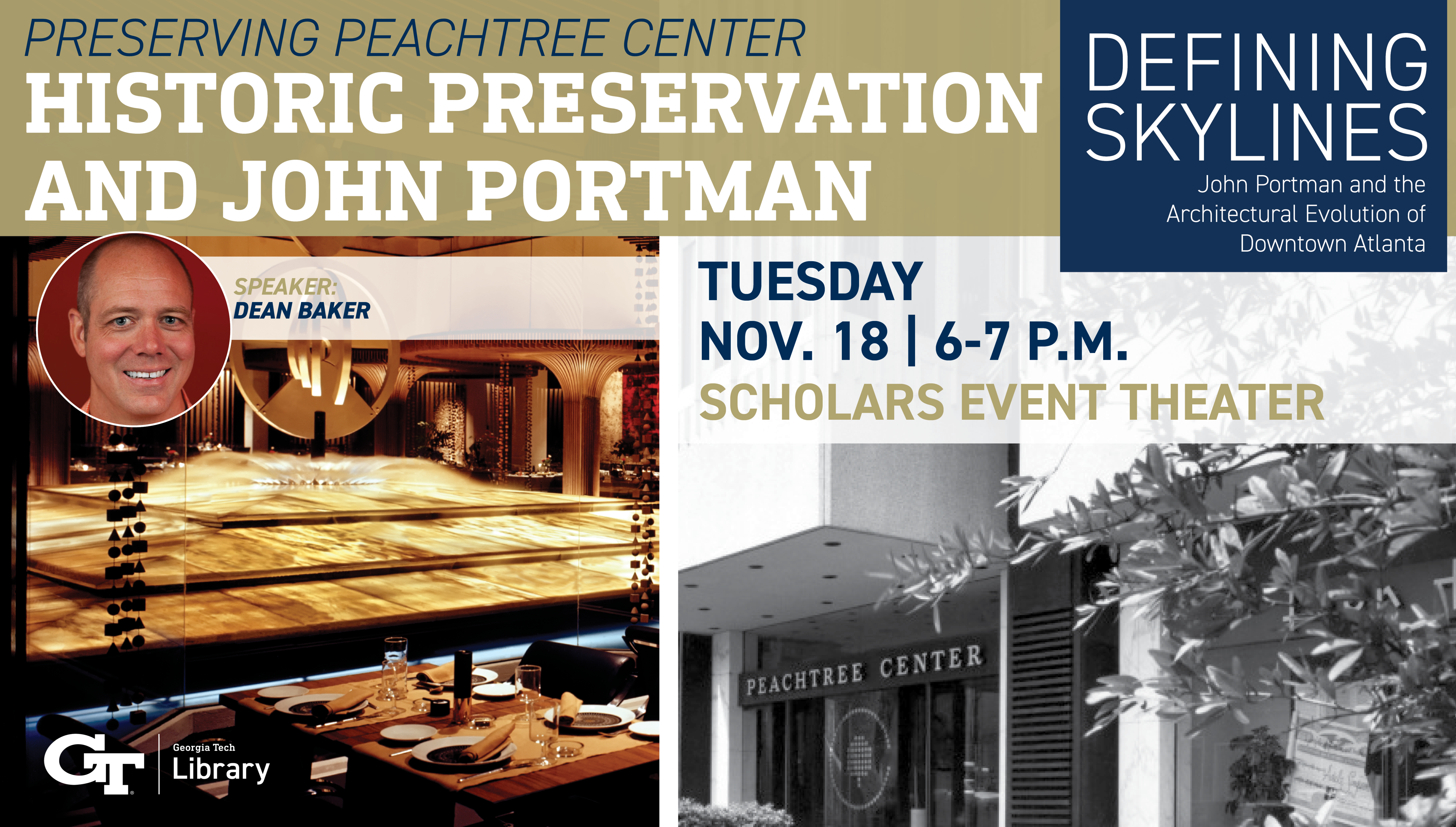 Join the Georgia Tech Library for Preserving Peachtree Center: Historic Preservation and John Portman Tuesday, Nov. 18 from 6 to 7 p.m. in the Scholars Event Theater, located on the first floor of Price Gilbert.