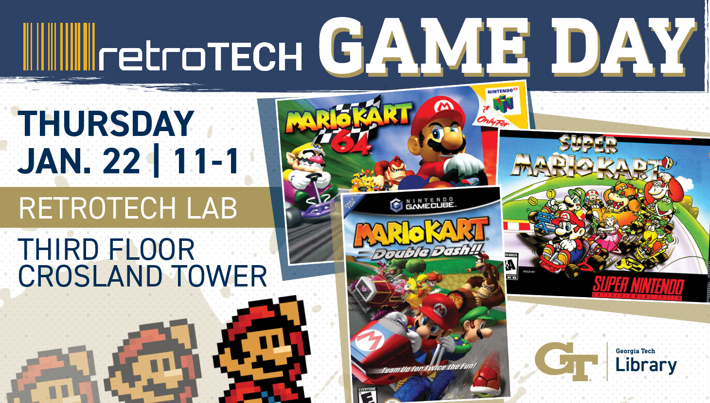 Join the Georgia Tech Library in the retroTECH Lab, located on the third floor of Crosland Tower, Thursday, Jan. 22 from 11 a.m. to 1 p.m. for our retroTECH Game Day featuring various versions of Mario Kart.